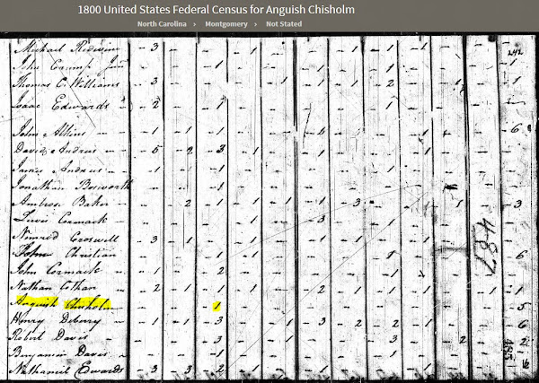 Angus Chisholm can first be found on the 1800 Census record for Montgomery County, North Carolina. He is listed as Anguish. Anguish is generally connected to the Irish name Aengus or Óengus and is a masculine given name in English; an Anglicized form of the Scottish Gaelic and Irish Aonghas, which is composed of Celtic elements meaning "one", and "choice". A variant spelling of the Scottish Gaelic name is Aonghus. The Irish form of the Scottish Gaelic name is Aengus. (Wikipedia)