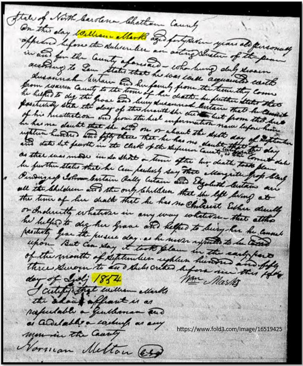 Abner Gunter Esq. age seventy-six years old, a native resident of Chatham County and the county register for thirty years, states that, “he has been well acquainted with Susannah Certain and her children from the time they came from Warren County to the time of her death. That she lived in his immediate neighborhood for many years…that she was this deponent’s wife’s aunt, (proving that Susan Marks Gunter is the daughter of William Marks and Temperance Wright) that the deponent now owns and resides on the plantation that William Marks, the brother-in-law of Susannah Marks (should say Certain?) lived and that the family burying ground or graveyard for the family is on his plantation. That some time in the early part of September 1853 he was informed that Susannah Certain was dead and they come to his place and dug her grave in the family graveyard, and she was buried.”