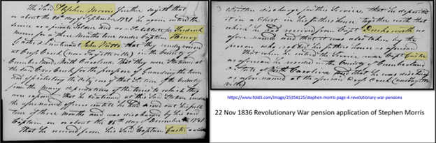 Stephen was a soldier in the Revolutionary War and lived long enough to file his pension claim which provides a lot of information. His claim states that he substituted for Frederick Morris but does not say what his relationship to Frederick is. The claim also provides his birthplace as Juniper Creek in Cumberland County, the same place Frederick Morris lived, in the year 1768.