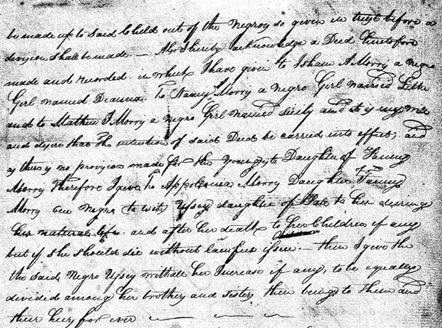 For the youngest daughter of Fanny Morris, Appalonicia Morris, daughter of Fanny Morris, one negro, Ussey, daughter of Pat.